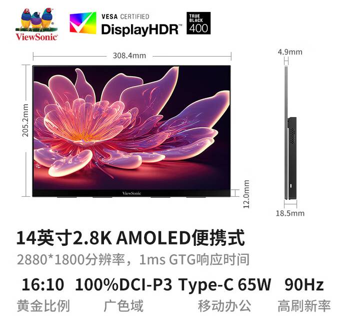 优派14英寸便携式显示器 2.8K OLED屏 100%DCI-P3色域 HDR400 手机电脑笔记本副屏PS5扩展 VX14P1-3K