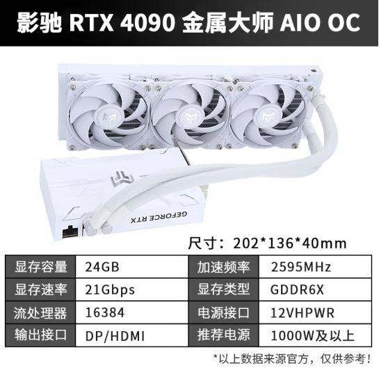 商品名称:影驰RTX 4090 金属大师 AIO OC 商品编号:10084712363973 店铺: 影驰旗舰店 商品毛重:5.0kg 商品产地:中国大陆 芯片组:NVIDIA 性能:游戏,发烧,科学运算 适用游戏:巫师3,GTA5,Apex英雄 质保期:3年 显存位宽:384bit 显存容量:24GB 接口:HDMI,DP 显卡型号:RTX 4090 散热风扇:水冷 显存类型:GDDR6X 灯效:无光
