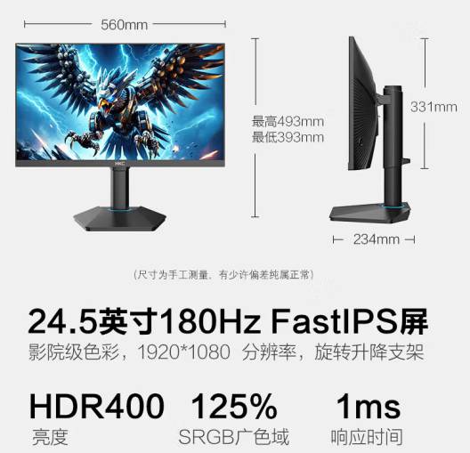 HKC 24.5英寸180Hz高刷FastIPS快速液晶HDR400显示屏1ms旋转升降电竞游戏电脑显示器 猎鹰二代G25H1